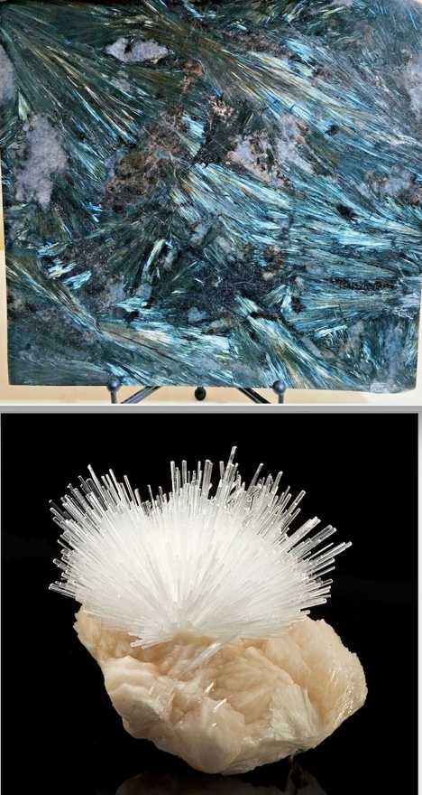 The rare minerals Arfvedsonite and Scolecite, pictured left, are thought to be the only know stones that can hold or store this Plasma Light energy. Perhaps it is due in part to the fact that Arfvedsonite crystalizes in large masses that contain small prismatic shards and fan-like prisms similar to the extensive coronal filaments of the sun. Arfvedsonite is a Sodium, Iron Silicate, [Na][Na2][(Fe2+)4Fe3+][(OH)2|Si8O22], often found in combination with the rare mineral Astrophyllite, (K,Na)3(Fe++,Mn)7Ti2Si8O24(O,OH)7. Scolecite is a tectosilicate mineral belonging to the zeolite group; it is a hydrated calcium silicate, CaAl₂Si₃O₁₀·3H₂O. Scolecite is both pyroelectric and piezoelectric. Both Arfvedsonite and Scolecite have a natural Bovis Value of 500 Billion. (Ref. Bovis Life Force Dowsing Chart)